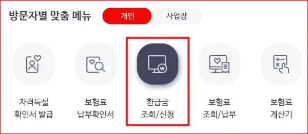 1) 건강보험 홈페이지에 접속해서 상단 메뉴 민원여기요 ➡ 개인민원 또는 첫 화면의 방문자별 맞춤 메뉴의 환급금 조회/신청으로 들어갑니다.