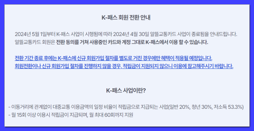 기존 알뜰교통카드 사용자는 추가로 K패스 카드를 발급받거나 가입하지 않아도 K패스 교통카드를 이용할 수 있습니다.